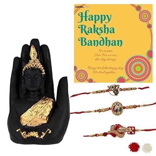 Webelkart Resin Rakhi With Palm Buddha Showpiece, Medium, Multicolour, 3 Rakhi, 1 Packet Roli Chawal, 1 Best Wishes Card, 1 Premium Showpiece
