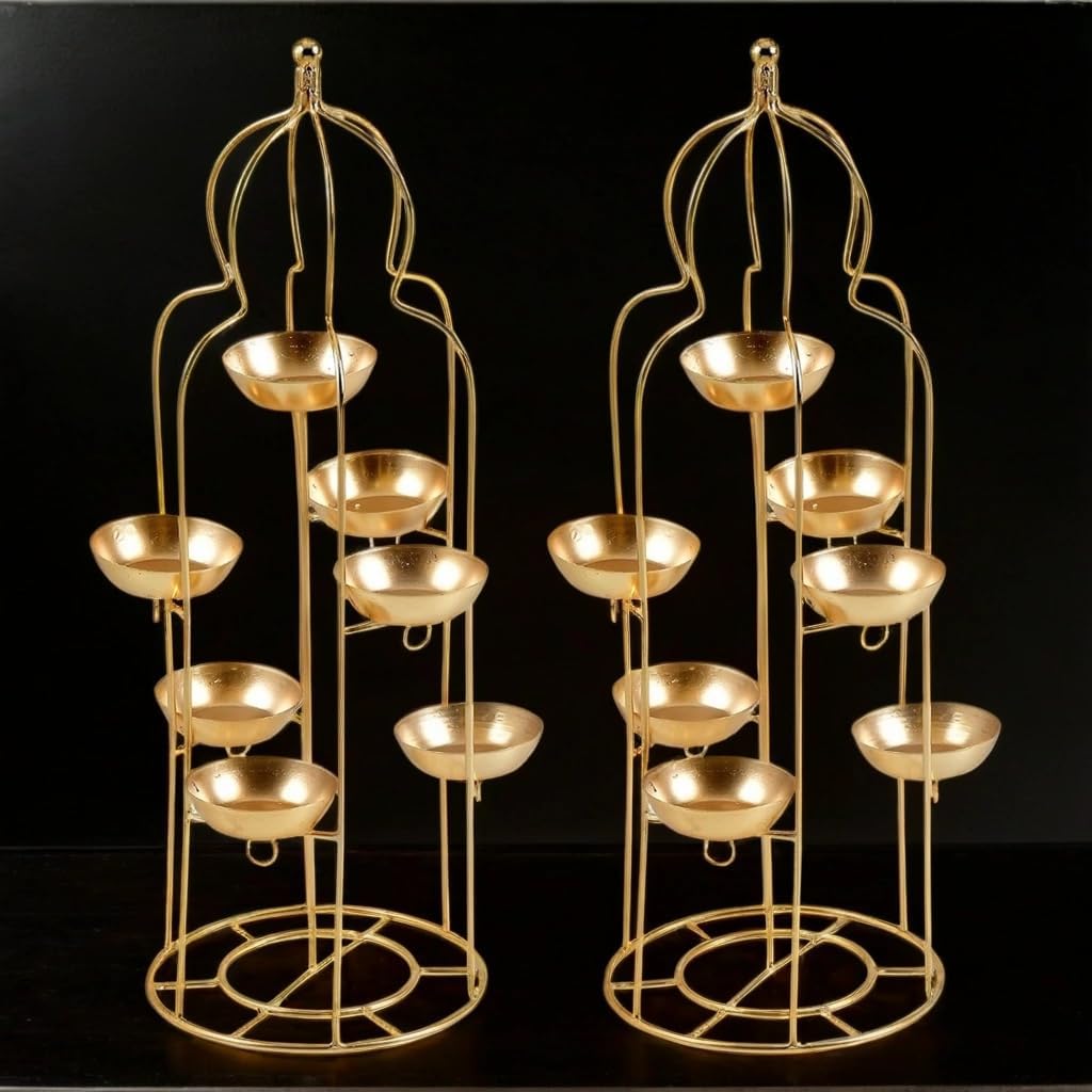 - ELEGANT DESIGN: Premium 7-tier metal diya stand with golden finish, featuring a beautiful temple-inspired dome design, perfect for festive decorations
