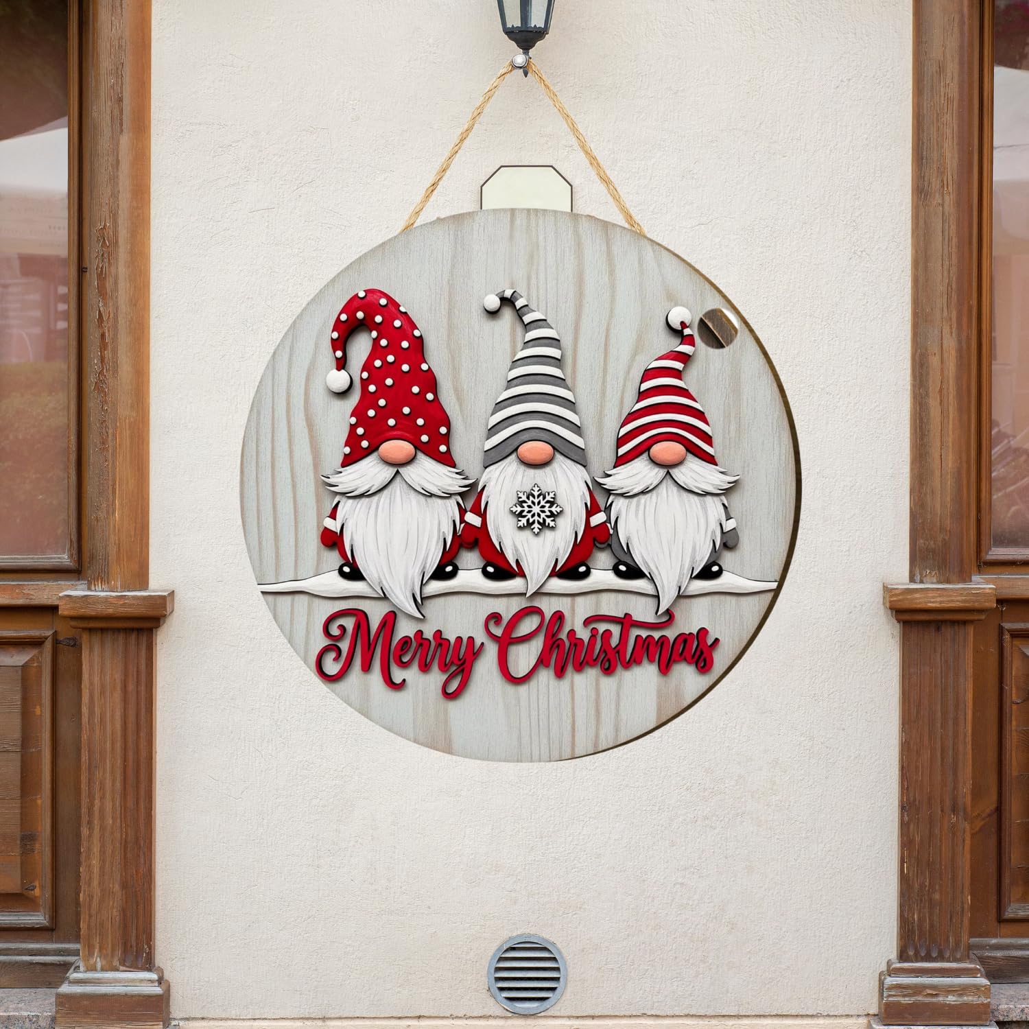 - FESTIVE DESIGN: Charming wooden Christmas wall hanging featuring three adorable gnomes with polka dot and striped hats, white beards, and a beautiful 'Merry Christmas' script