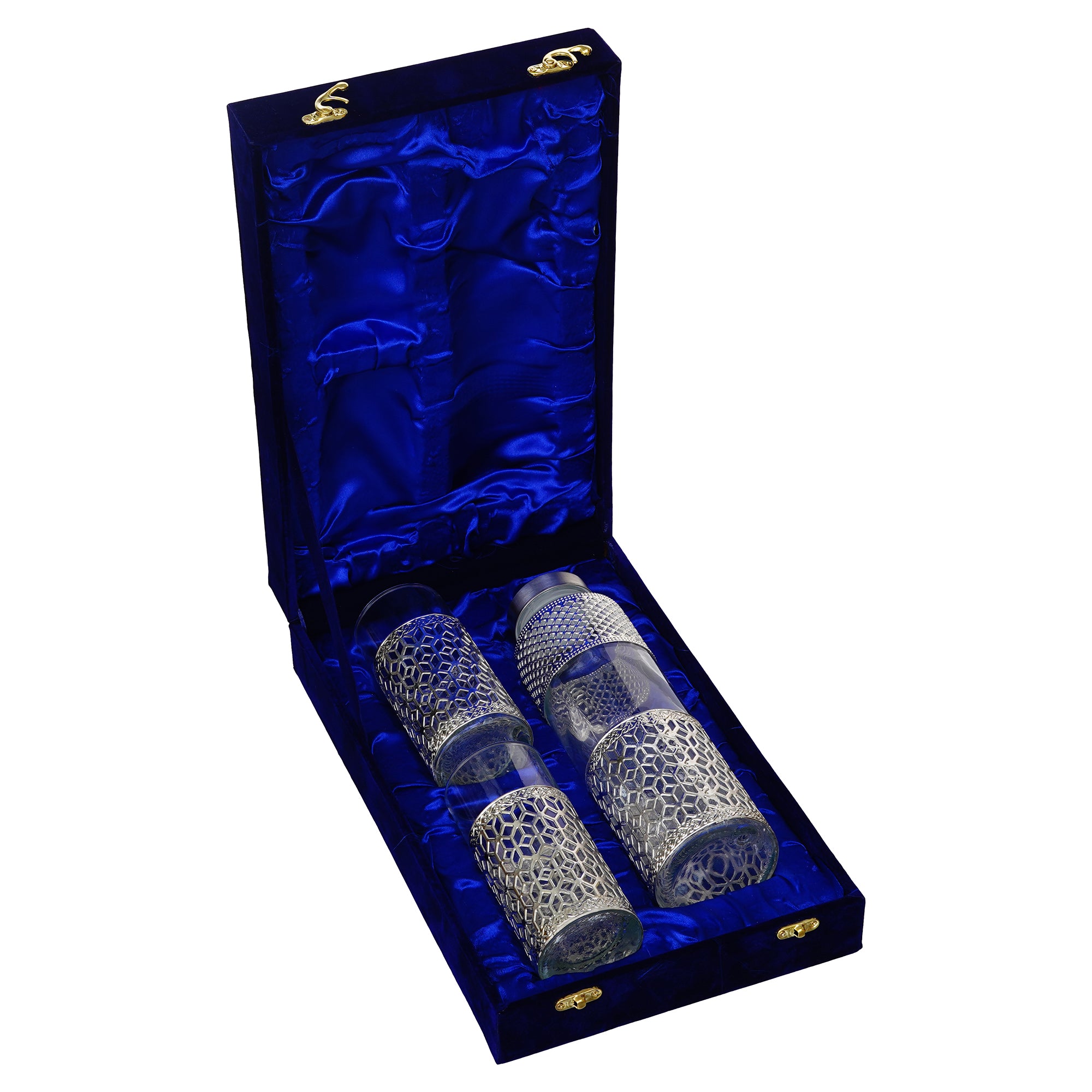 Webelkart Premium 1 Water Bottle with 2 Luxury Tumblers Glass with Velvet Box| Silver Metal Sleeve Design | Elegant Drinkware Set for Home, Dining & Office | Ideal Gift for & Diwali Festivals
