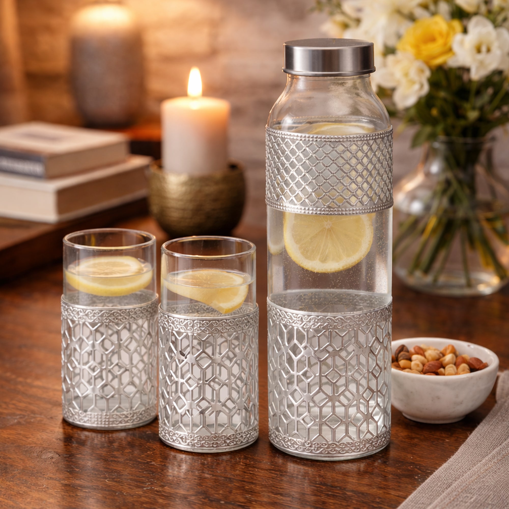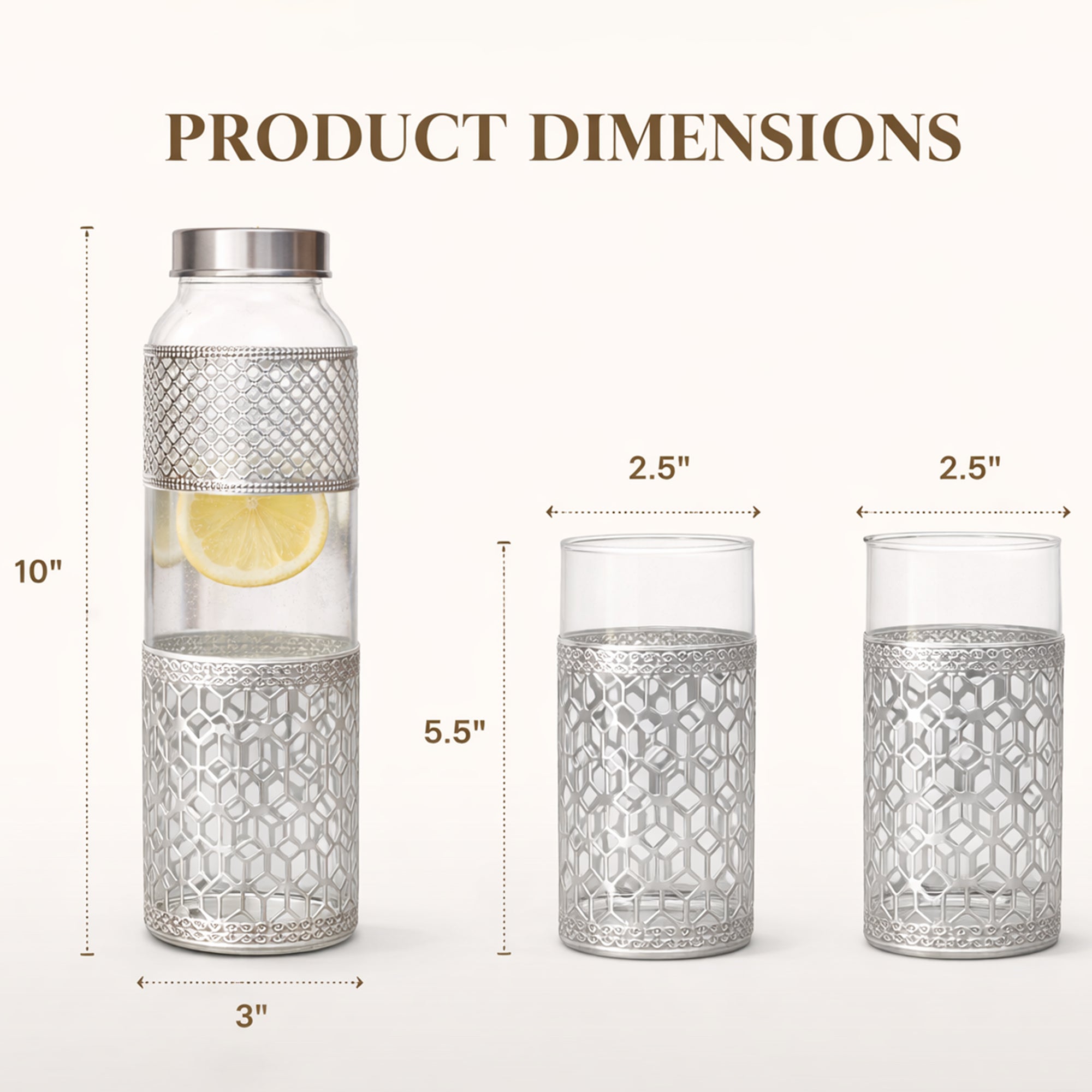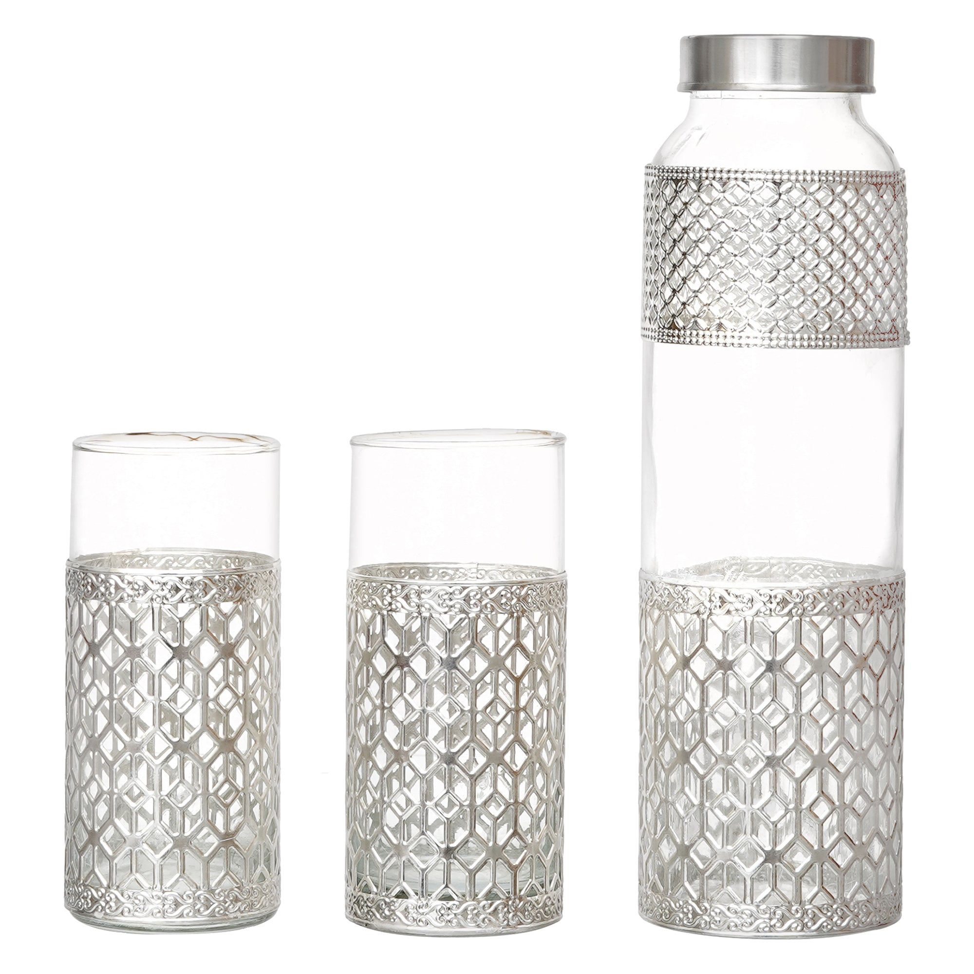 - ELEGANT DRINKWARE SET: Premium set includes 1 glass water bottle with stainless steel lid and 2 matching tumblers, all featuring intricate silver metal sleeve design with geometric pattern