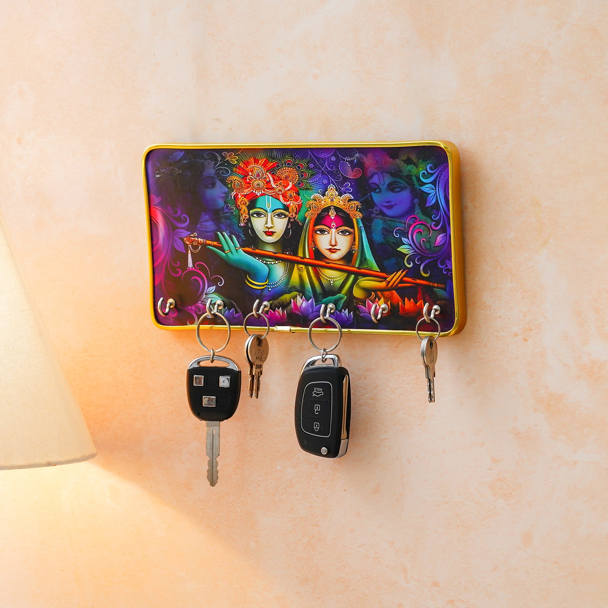 Webelkart Decorative Radhe Krishna Theme Wooden Key Holder for Home Decor,Wall Mounted Key Organizer, Key Chain Holder (10" Inches)