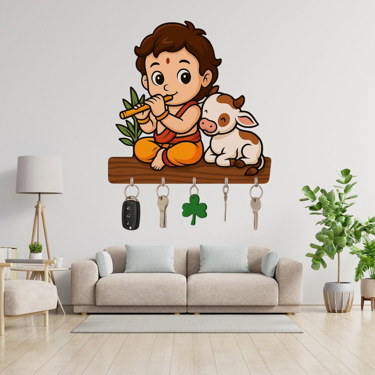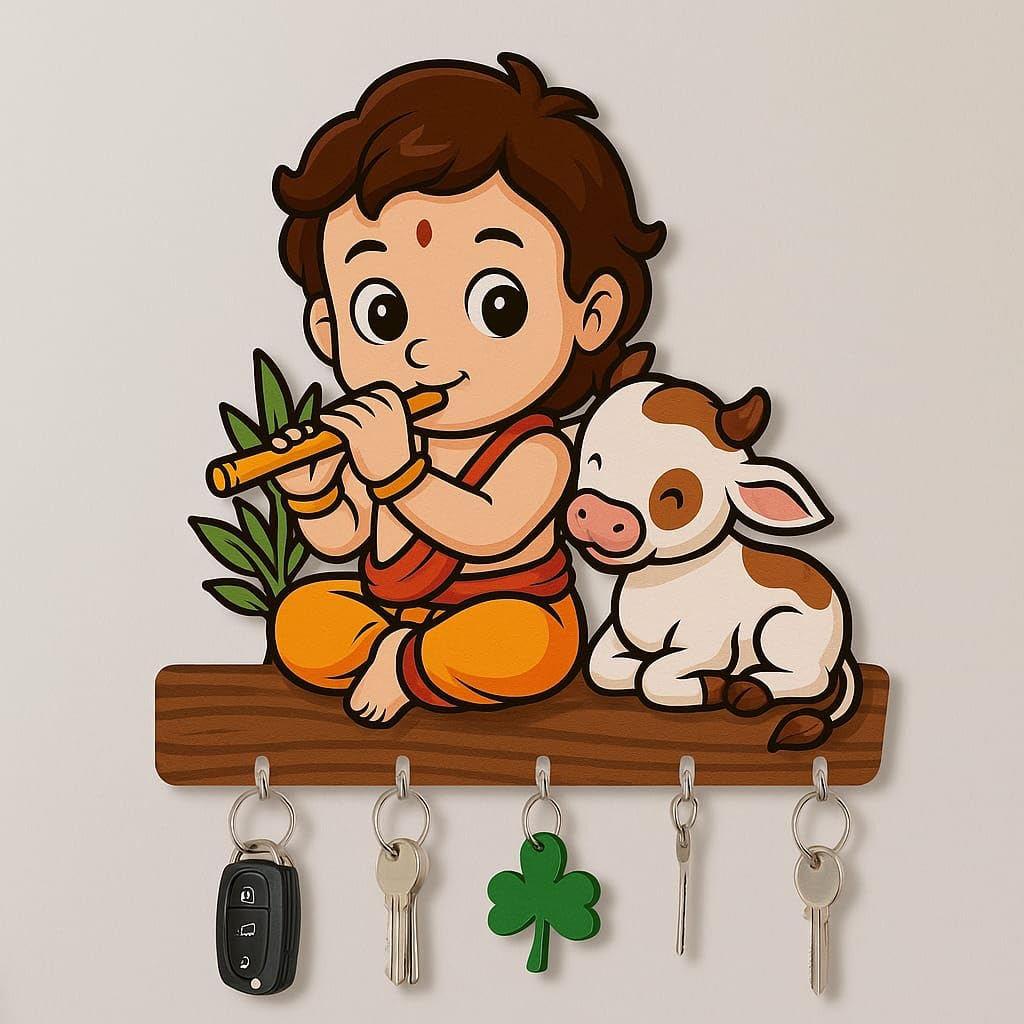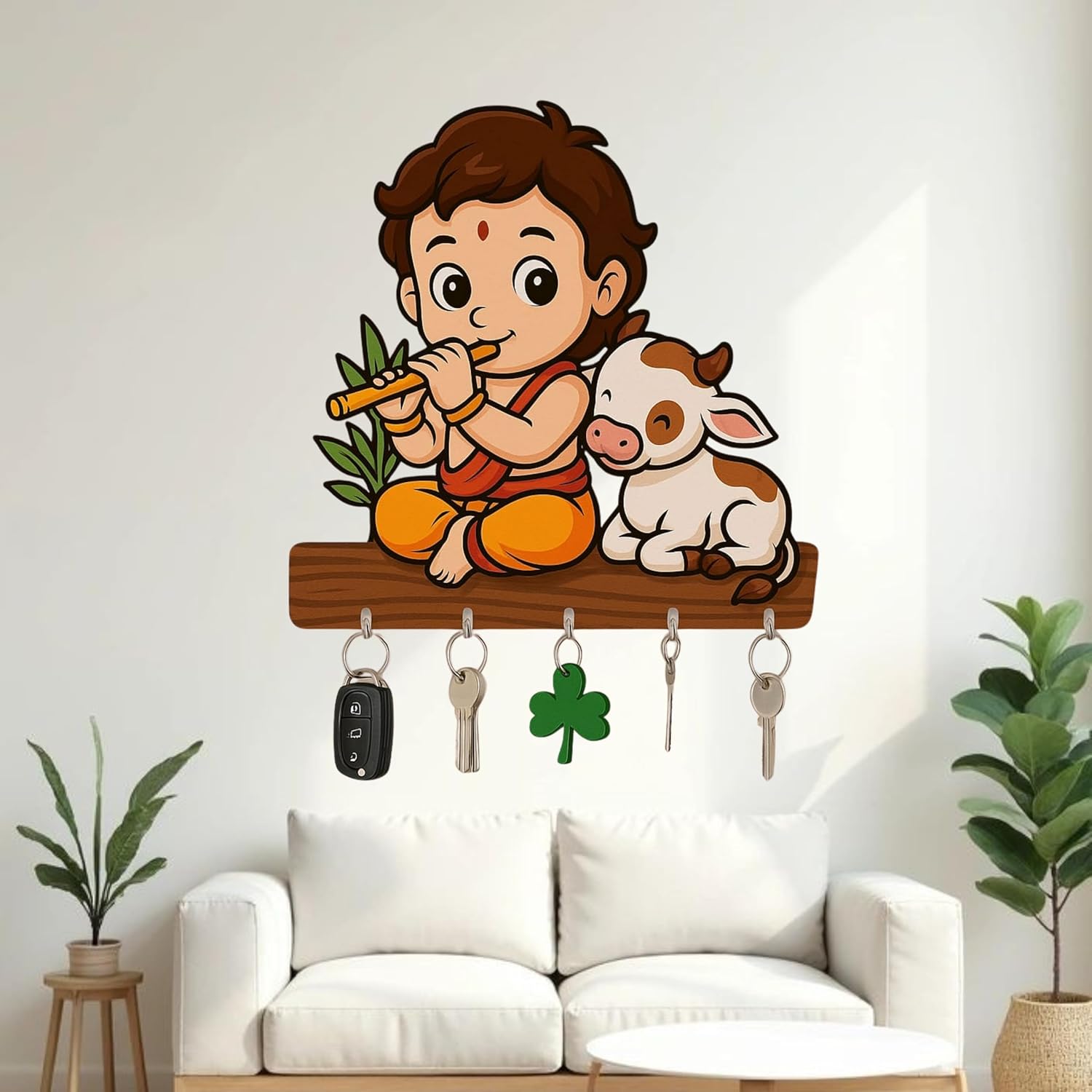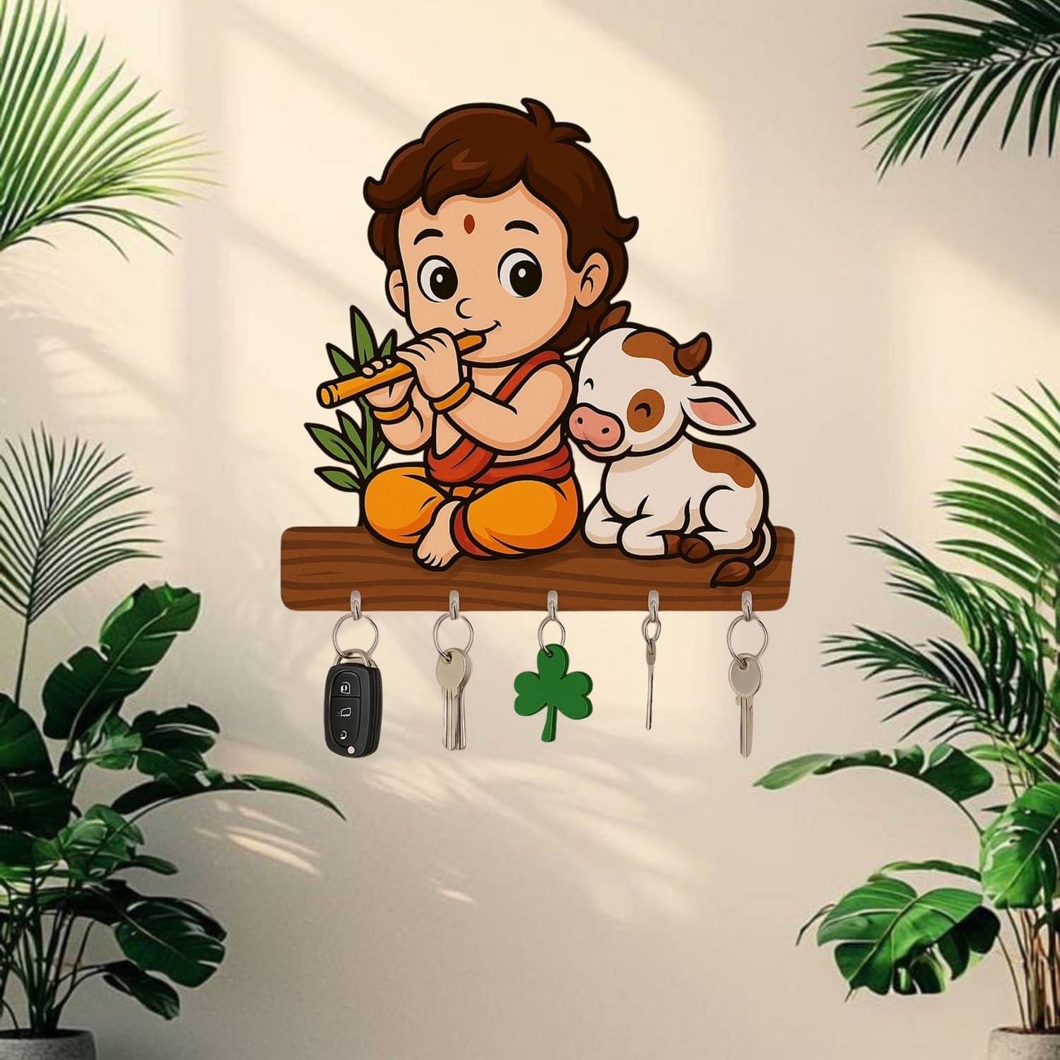 - DESIGN THEME: Beautiful Baby Krishna with cow motif key holder crafted in premium brown wood, perfect for adding spiritual charm to your home decor