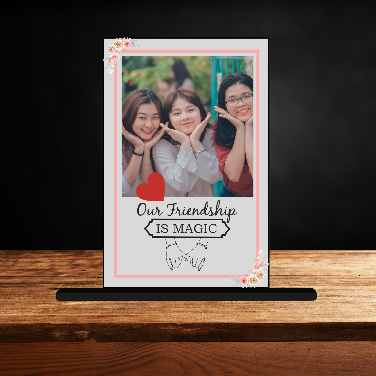 - DESIGN FEATURES: Comes with a sturdy table stand for easy display and showcases a friendship goals themed print