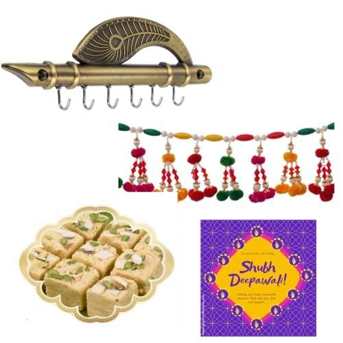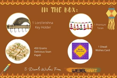- Package Contains : 1 Lord krishna key holder, 1 Diwali Wishes Card, 1 Premium Toran and 450 Gram Delicious Soan Papdi Sweets