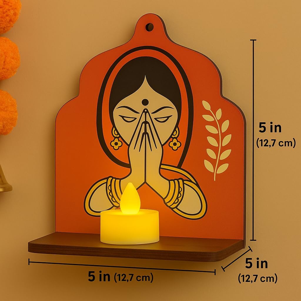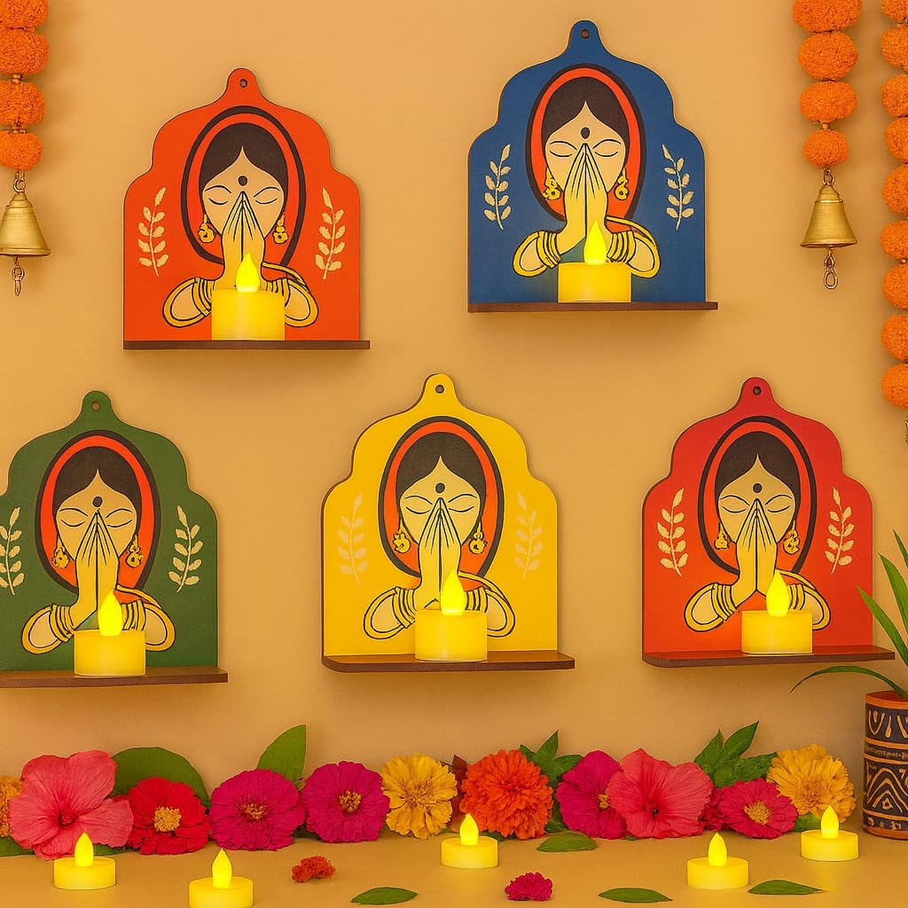 Webelkart Premium Handcrafted Wooden Wall Diya Holder – Traditional Indian Namaste Lady Design Wall Shelf for Diwali Decor,Tealight Candle Holder (Set of 5) Wall Shelf