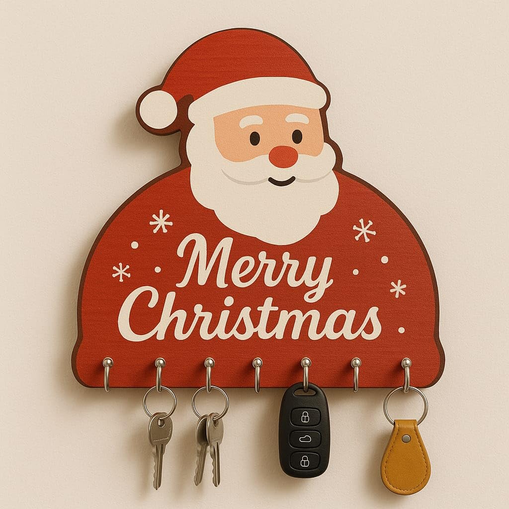 Webelkart Premium Home Sweet Home Santa Claus Wooden Key Holder for Home,Christmas Decoration and Gift Items for Home Decor (10 x 10 Inches, 7 Hooks)