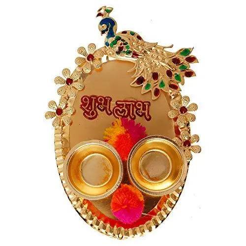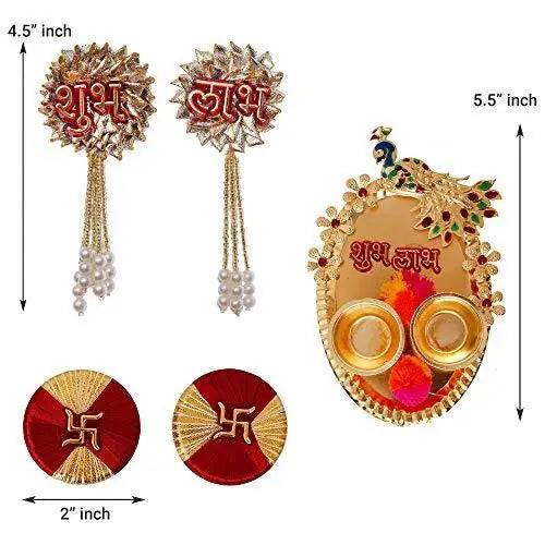 Webelkart Premium Combo of Designer Shubh Labh Wall Hanging, Swastika and Peacock Meenakari Pooja thali for Wall, Door, Diwali Decor