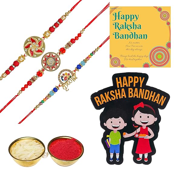 • Package Contains : 3 Rakhi, 1 Packet Roli Chawal, 1 Best Wishes Card With Raksha Bandhan Magnet For Bhaiya And Bhab