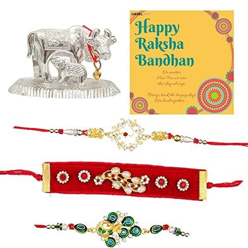 Webelkart Premium Combo of Rakhi Gift for Brother and Bhabhi and Kids with Premium Silver Plated Cow Calf Showpiece