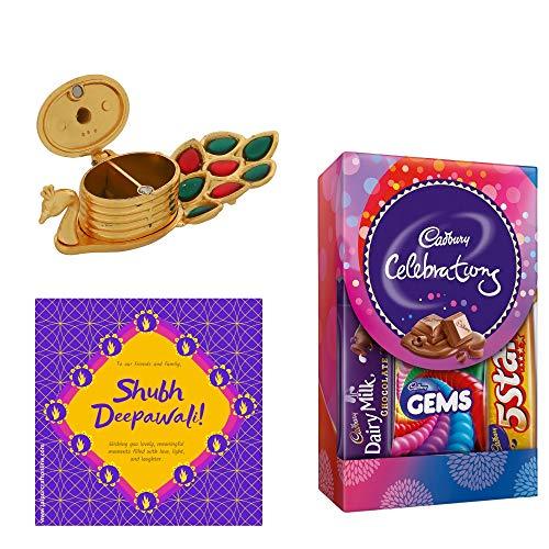 Webelkart Premium Diwali Gift Combo of Gold Plated Peacock Kumkum Box, 1 Cadbury Celebrations Chocolates Gift Pack