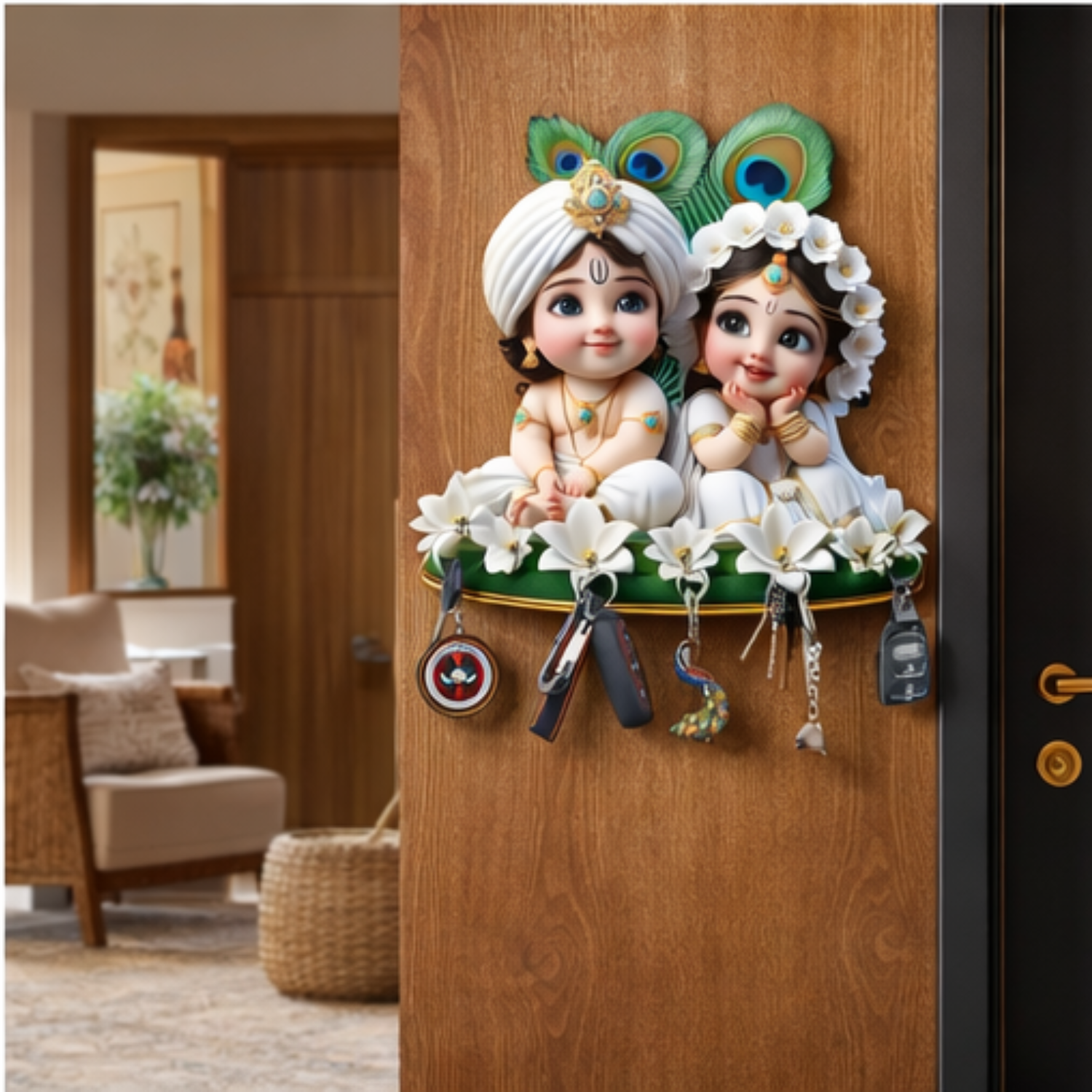 - DIVINE DESIGN: Features charming Radha Krishna idols adorned with gold jewellery, peacock feathers, and white floral accents for a sacred look.