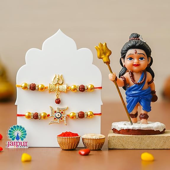 Webelkart Premium Set of 2 Shiv Designer Rakhi for Brother and Bhabhi With Cute Baal Shiv Idol For Car Dashboard,Rakhi For Bhai With Greeting Card and Roli Chawal