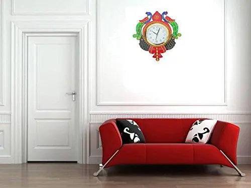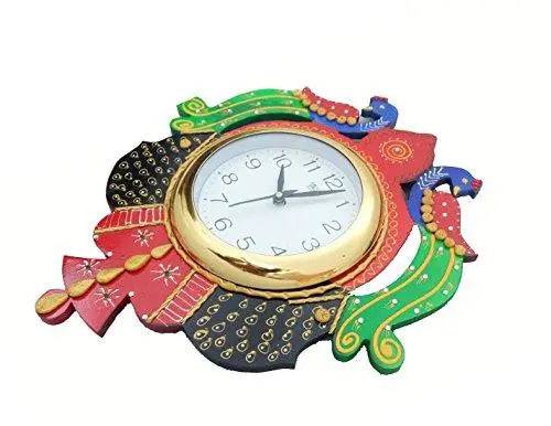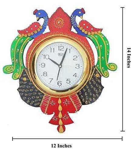 जयपुर शिल्प लकड़ी के मयूर एम्बॉस पेंटिंग दीवार घड़ी (12 X 14 इंच, बहुरंगी)