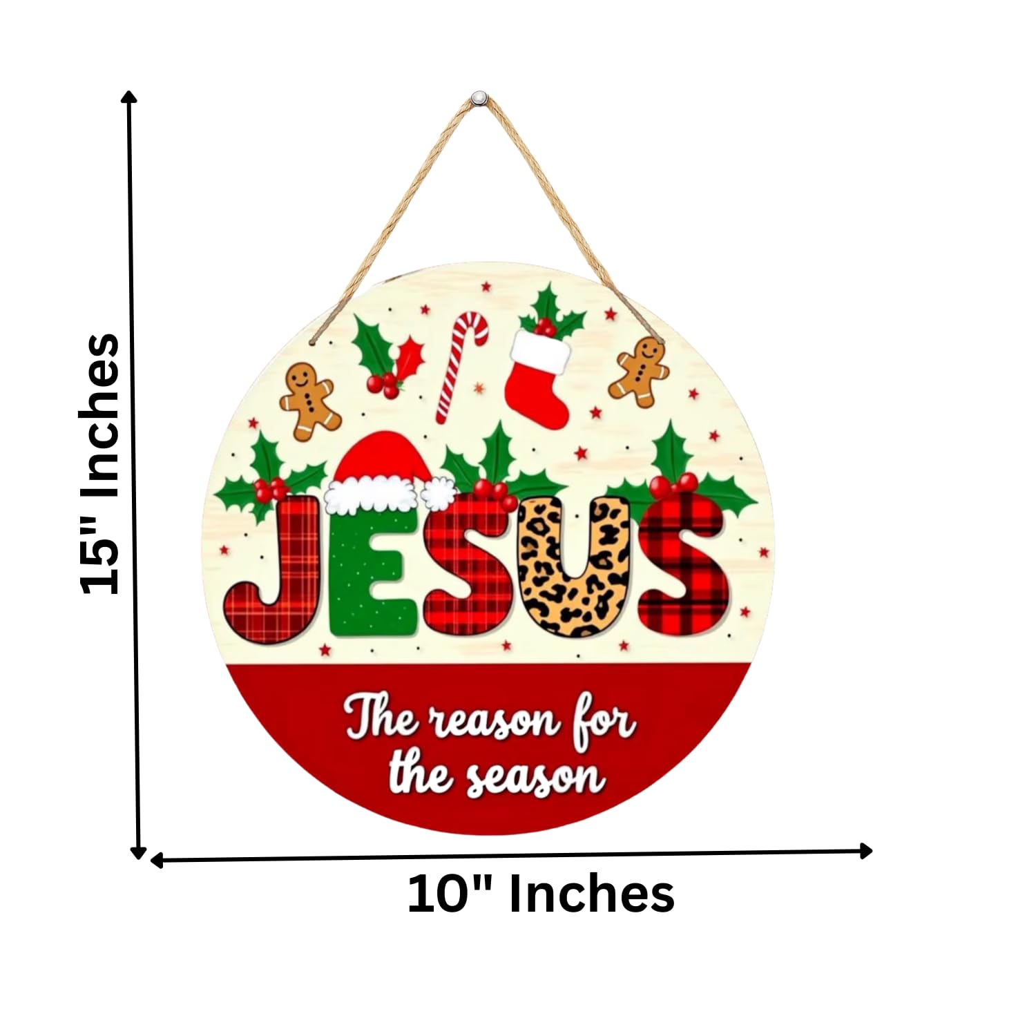 FESTIVE DESIGN: Beautiful Christmas-themed wall hanging featuring 'JESUS' text in plaid and leopard print patterns, adorned with holly leaves, stockings, and gingerbread men DIMENSIONS: Measures 25.5 centimetres in height, width, and depth, making it a perfect decorative accent for any wall or door during the holiday season QUALITY MATERIAL: Crafted...