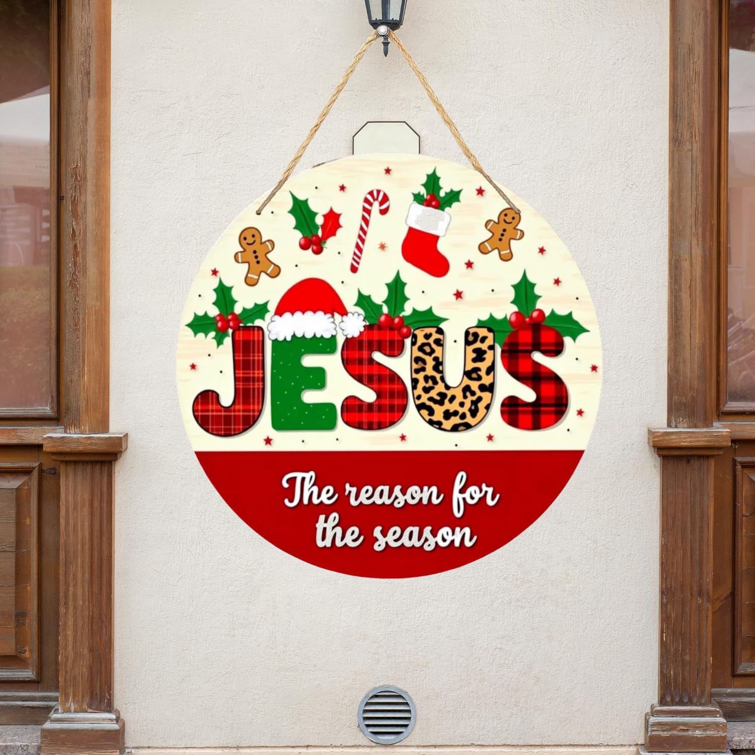 • FESTIVE DESIGN: Beautiful Christmas-themed wall hanging featuring 'JESUS' text in plaid and leopard print patterns, adorned with holly leaves, stockings, and gingerbread men