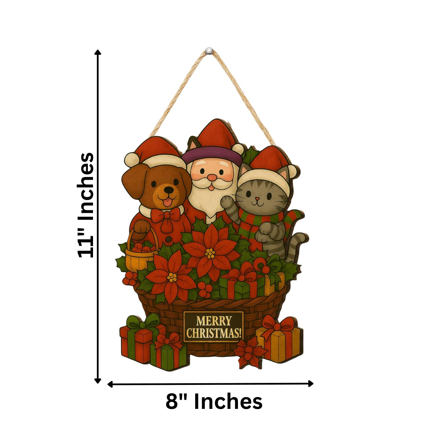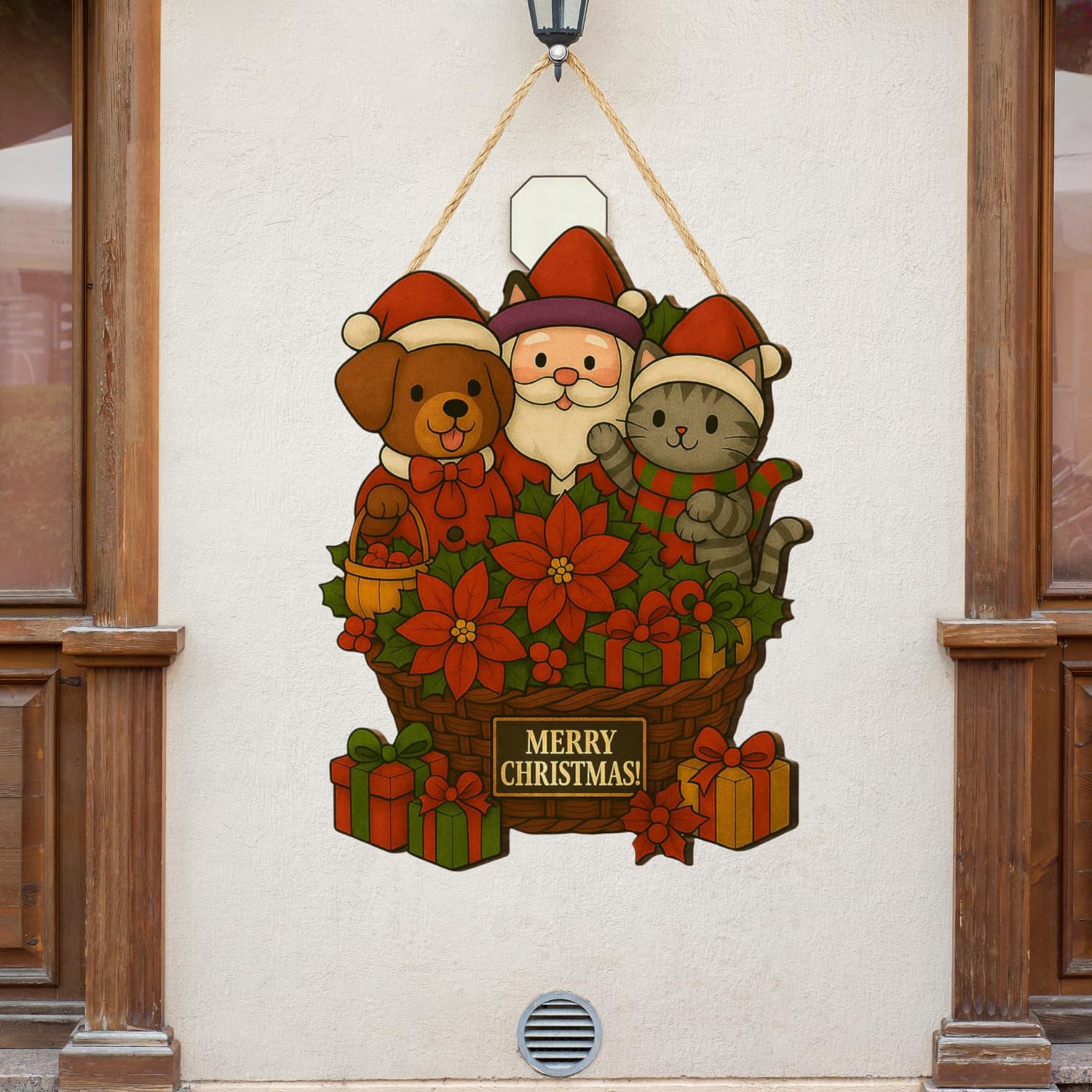 - FESTIVE DESIGN: Charming Christmas wall hanging featuring adorable pets in Santa hats with vibrant poinsettias and wrapped presents in a decorative basket arrangement