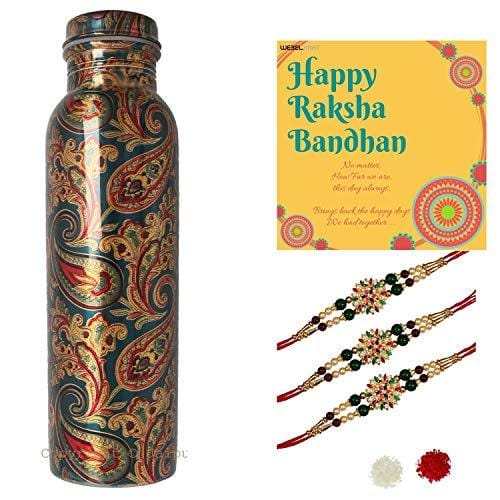 - Package Contains : 3 Rakhi, 1 Packet Roli Chawal, 1 Best Wishes Card, 1 Designer Printed Copper Water bottle