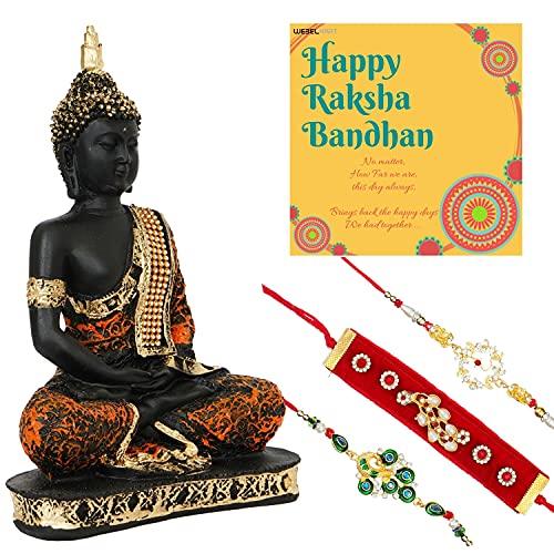 - Package Contents: 1 Sitting Buddha Figurine statue, 3 Premium rakhi, 1 Greeting Card