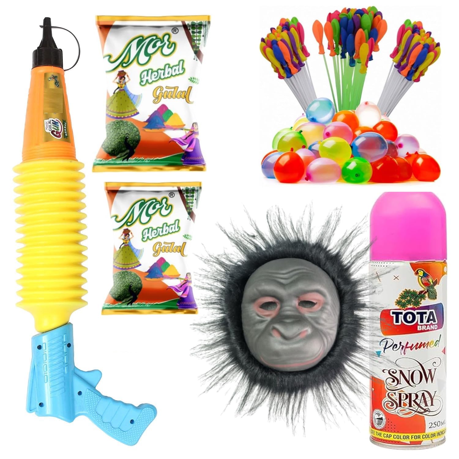 - COMPLETE PACK: Set includes 6 vibrant 2 herbal gulal colours,1 mini Snow Spray Bottle, and 37 water balloons,1 Gulal Gun. 1 Animal (Gorilla) Face Mask for a complete Holi celebration experience